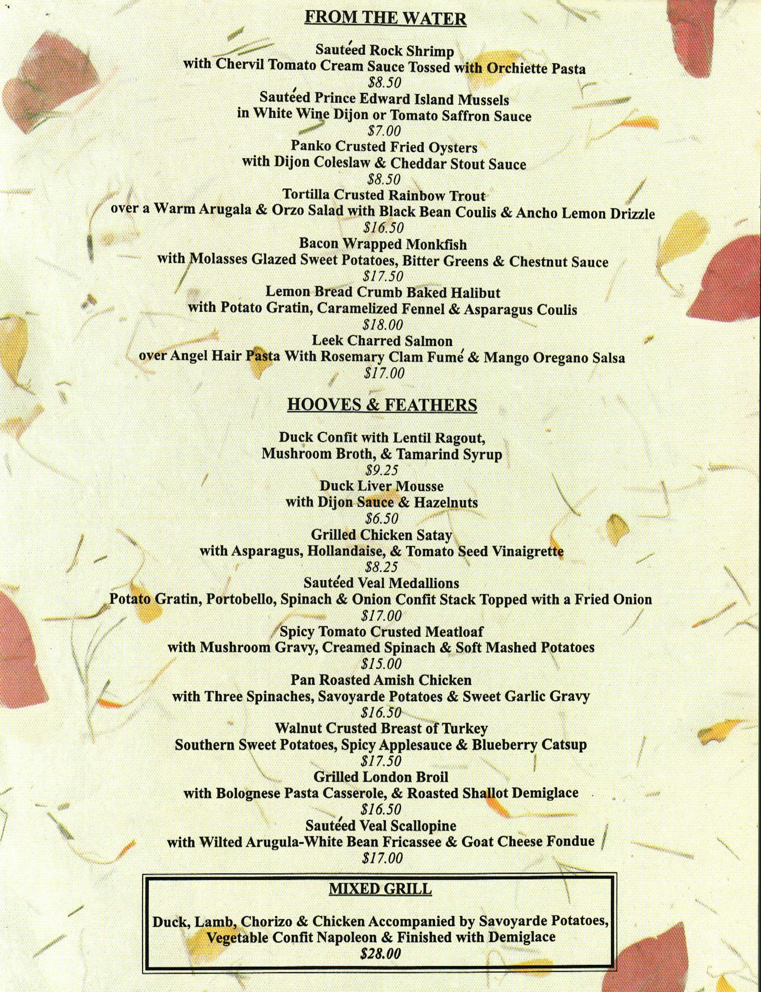 • Potato salad w Ham, Relish And Hard Boiled Eggs • Home Made Bread • Cranberry Cheddar Pecan Spinach and Arrugula Salad • Baked Cod w Lemon Wine and Parsley Bread Crumbs • BBQ Chicken, Grilled • Hanger Steak w Tomato Relish • Carrot Oregano and Roast Garlic Salad • Three Bean Salad w Romaine and Radiccio • Linguini w White Clam Sauce • Succotash(corn, lima beans, red onions, red peppers, herbs) • Fresh Corn (if available) Dessert • Apple Cobbler • Pumpkin Pie • Pecan Maple Pie • Strawberry Rhubarb Crumble(?